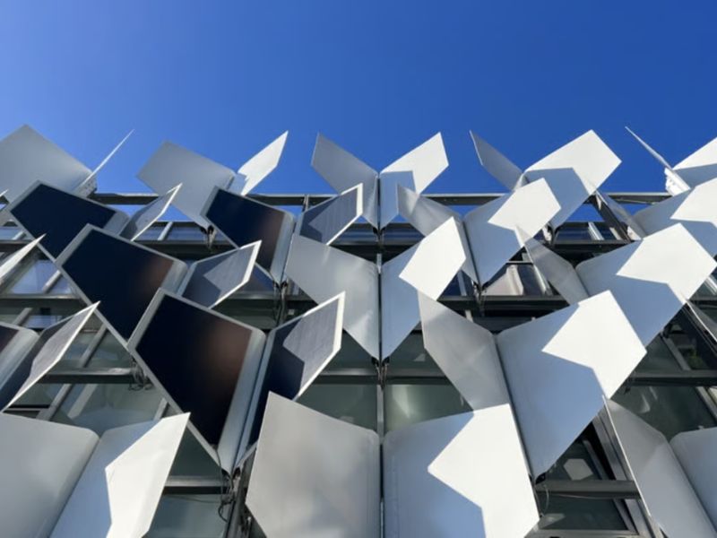 Quando as abas se abrem para fora, elas bloqueiam a luz solar, resfriando o edifício e reduzindo a necessidade de ar condicionado.