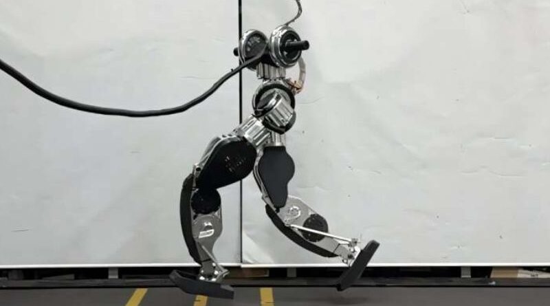 Crédito:KAIST humanoid lower body platform running. Credit: The Korea Advan O robô humanoide da KAIST demonstra mobilidade de alto nível, atingindo 12 km/h com excelente estabilidade e realizando movimentos complexos como o duckwalk e o moonwalk, marcando-o como uma plataforma de próxima geração para uso industrial.Desenvolvimento de uma Plataforma para a Parte Inferior do Corpo...