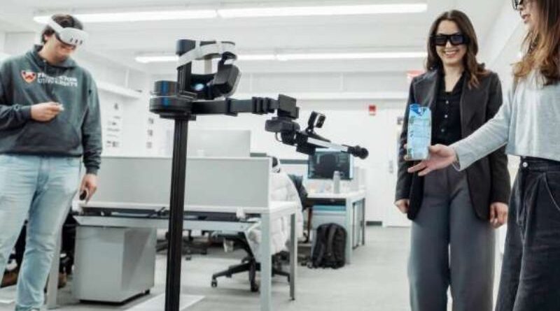 Crédito:Computer scientists Parastoo Abtahi, center, and Mohamed Kari, left, are are working to bring virtual reality into the physical world by pairing mixed reality headsets with robots. Doctoral student Lauren Wang, right, assists in demonstrating how the robot operates. Image Credits: Nick Donnoli/Orangebox Pictures Cientistas da computação de Princeton estão desenvolvendo maneiras de integrar a...